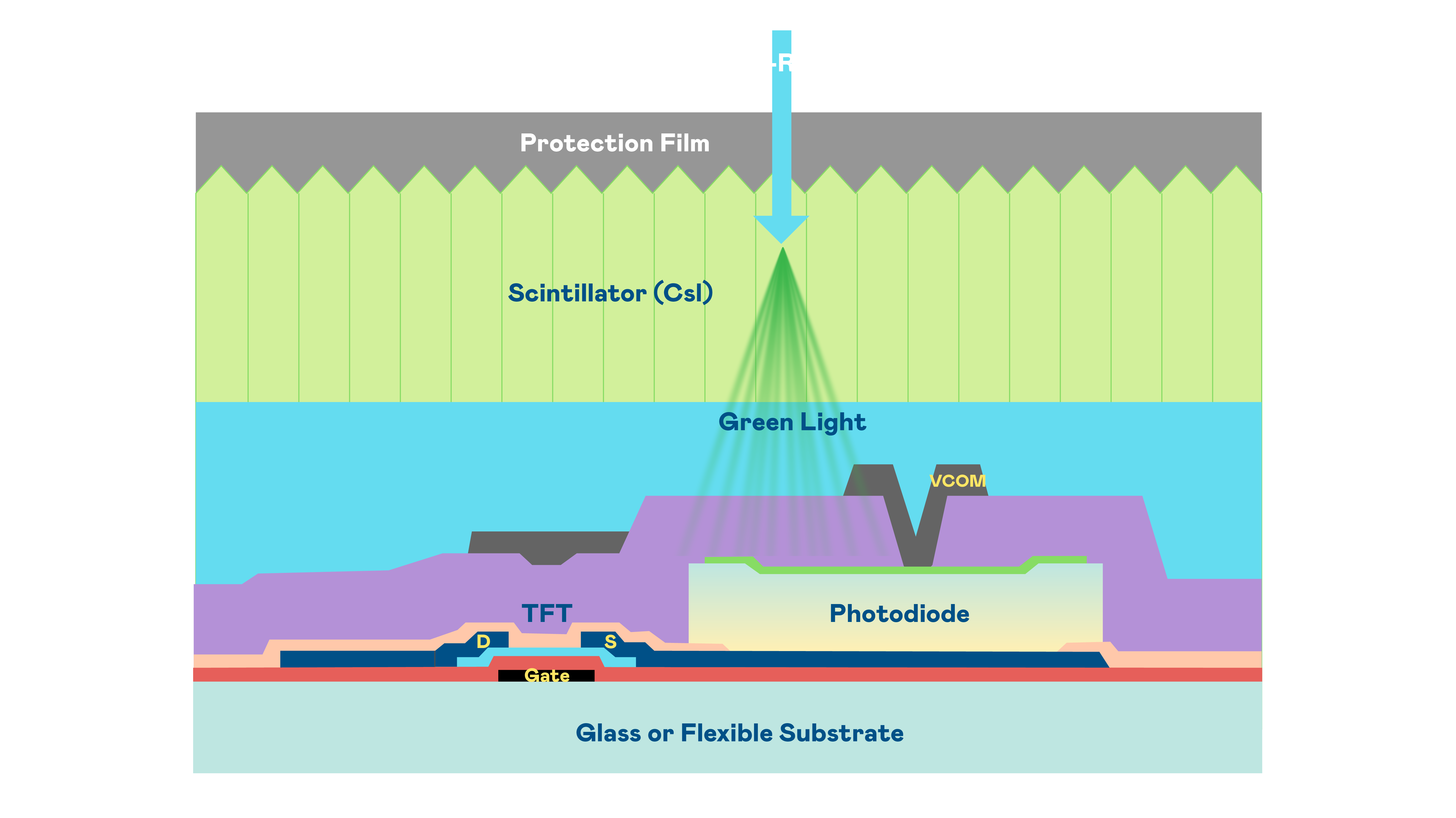 美狮贵宾会的X光影像感测阵列使用薄膜电晶体 (TFT) 作为每个像素的读取开关,搭配光电二极体(Photodiode)的光电转换元件,用以感测X光影像讯号。